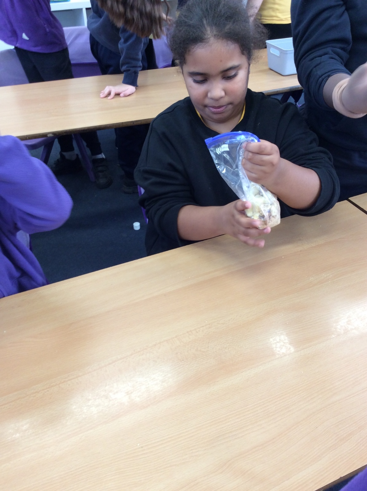 First, our hands did the job of the teeth and ground the food into small pieces and used a ziplock bag to represent the stomach.