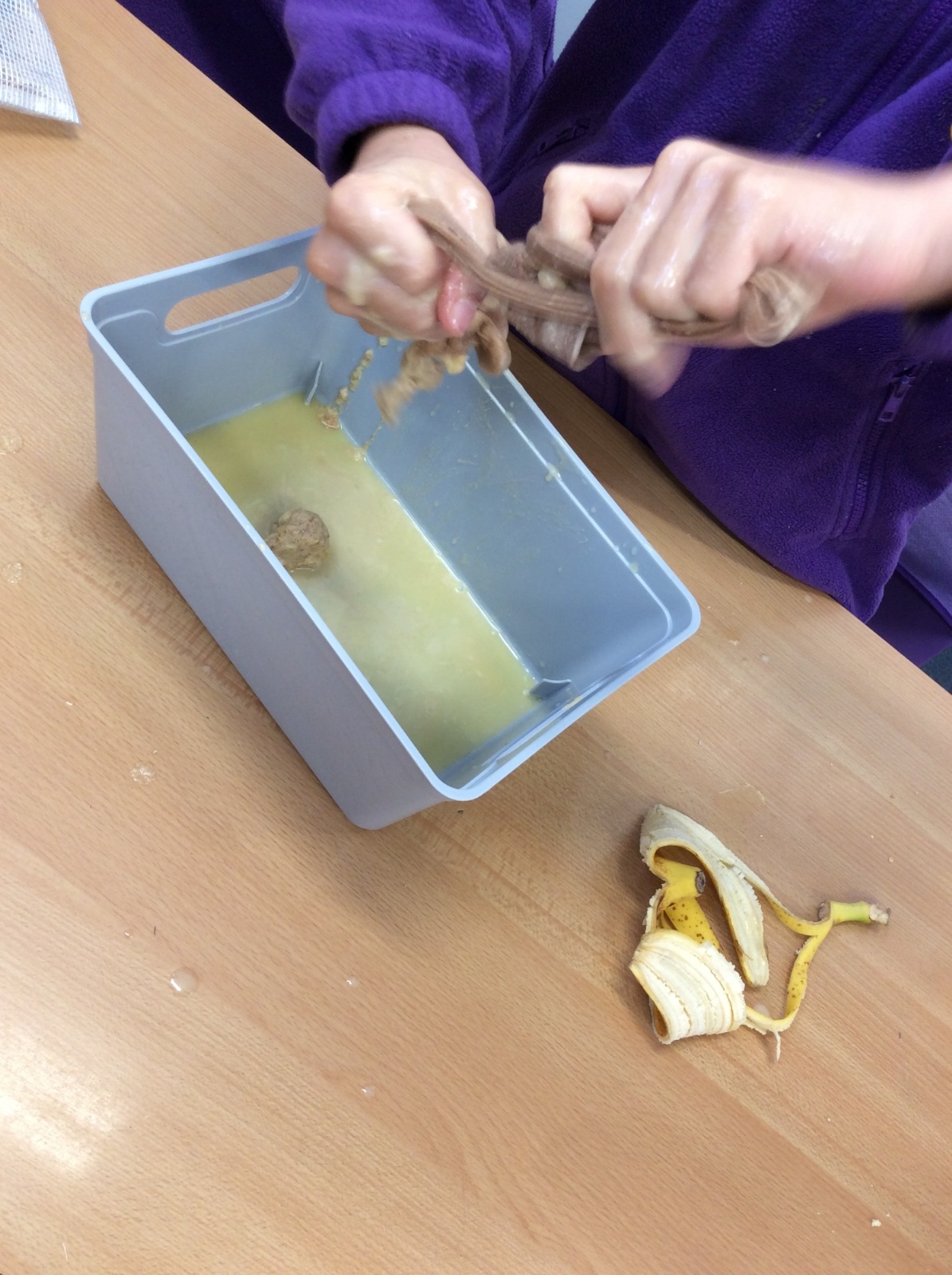 Then, we squeezed the liquid out of what remained to mimic the events in the large intestine.